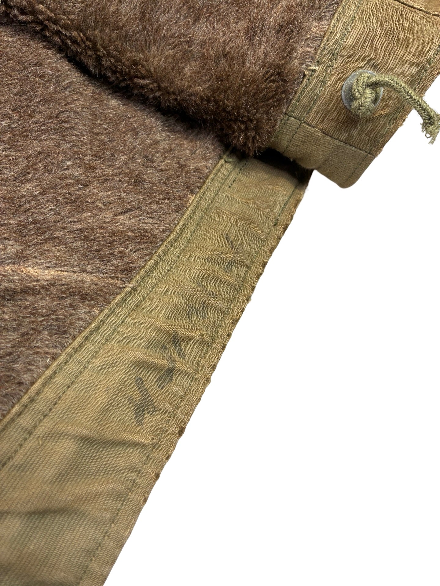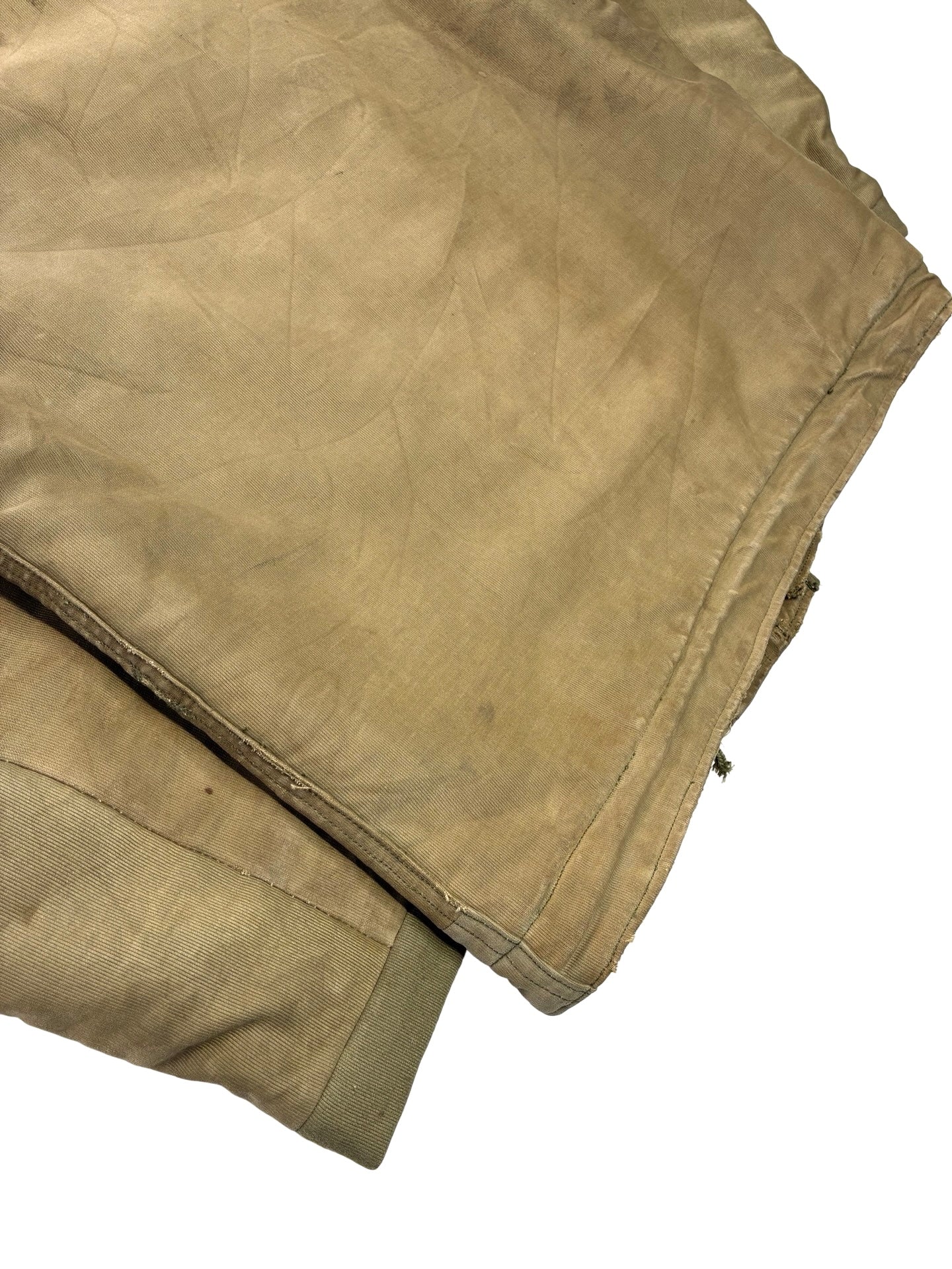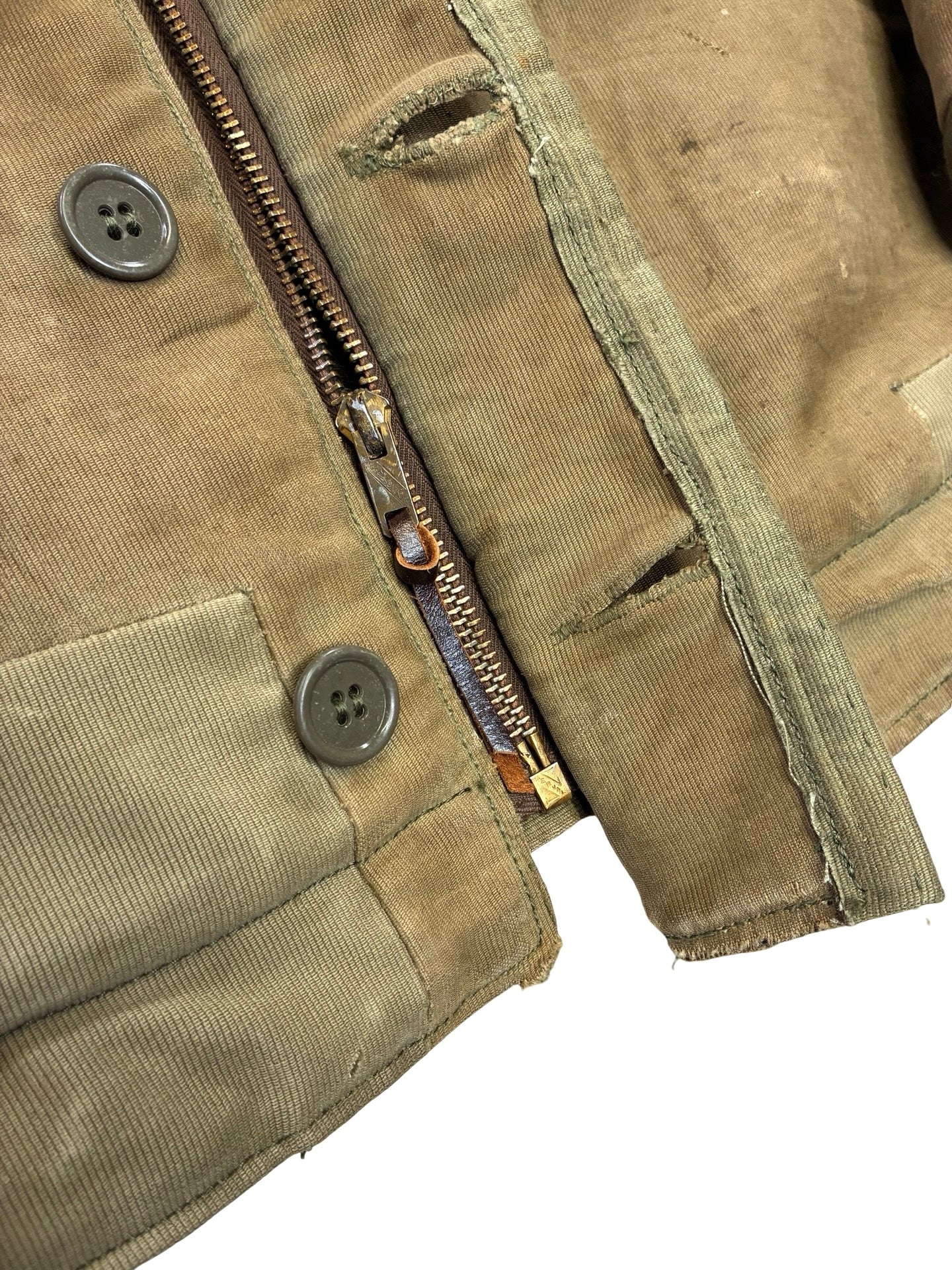 We have heavily repaired the shell with period correct fabric, some zig zag repairs. Some marks throughout as expected. Period zipper replacement.
