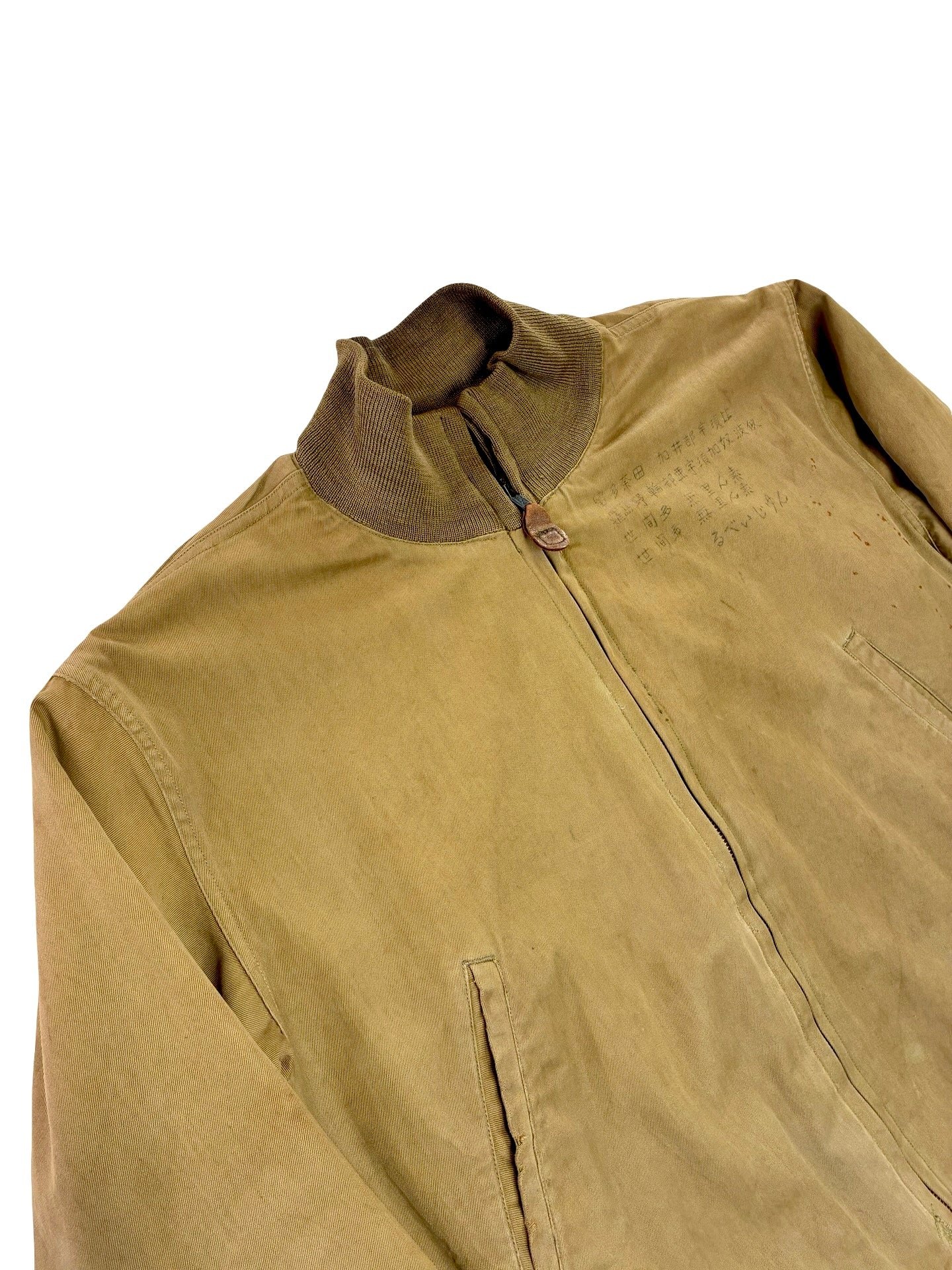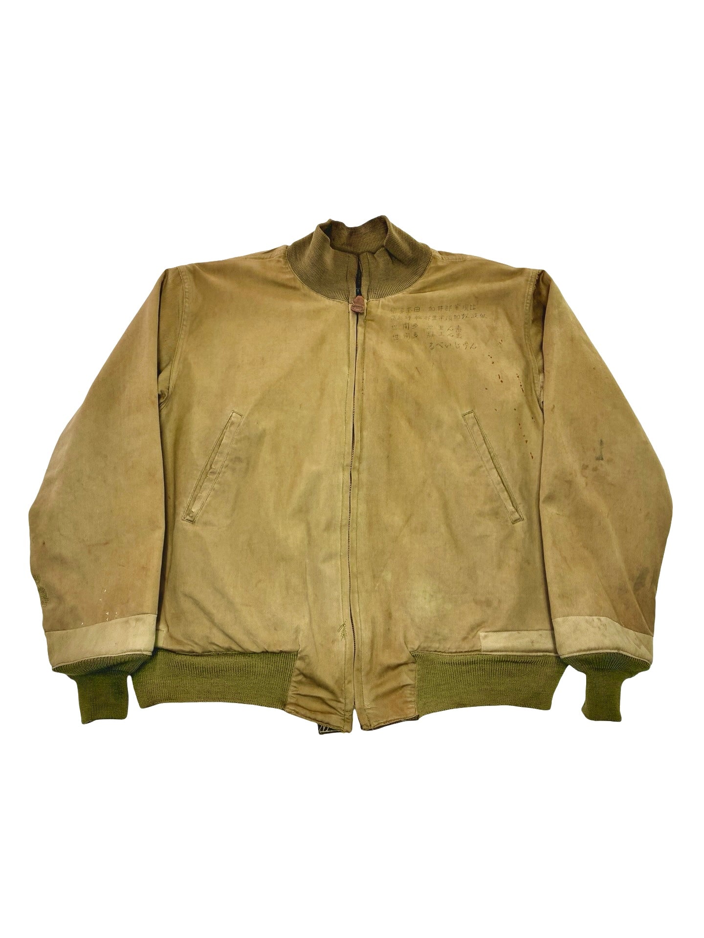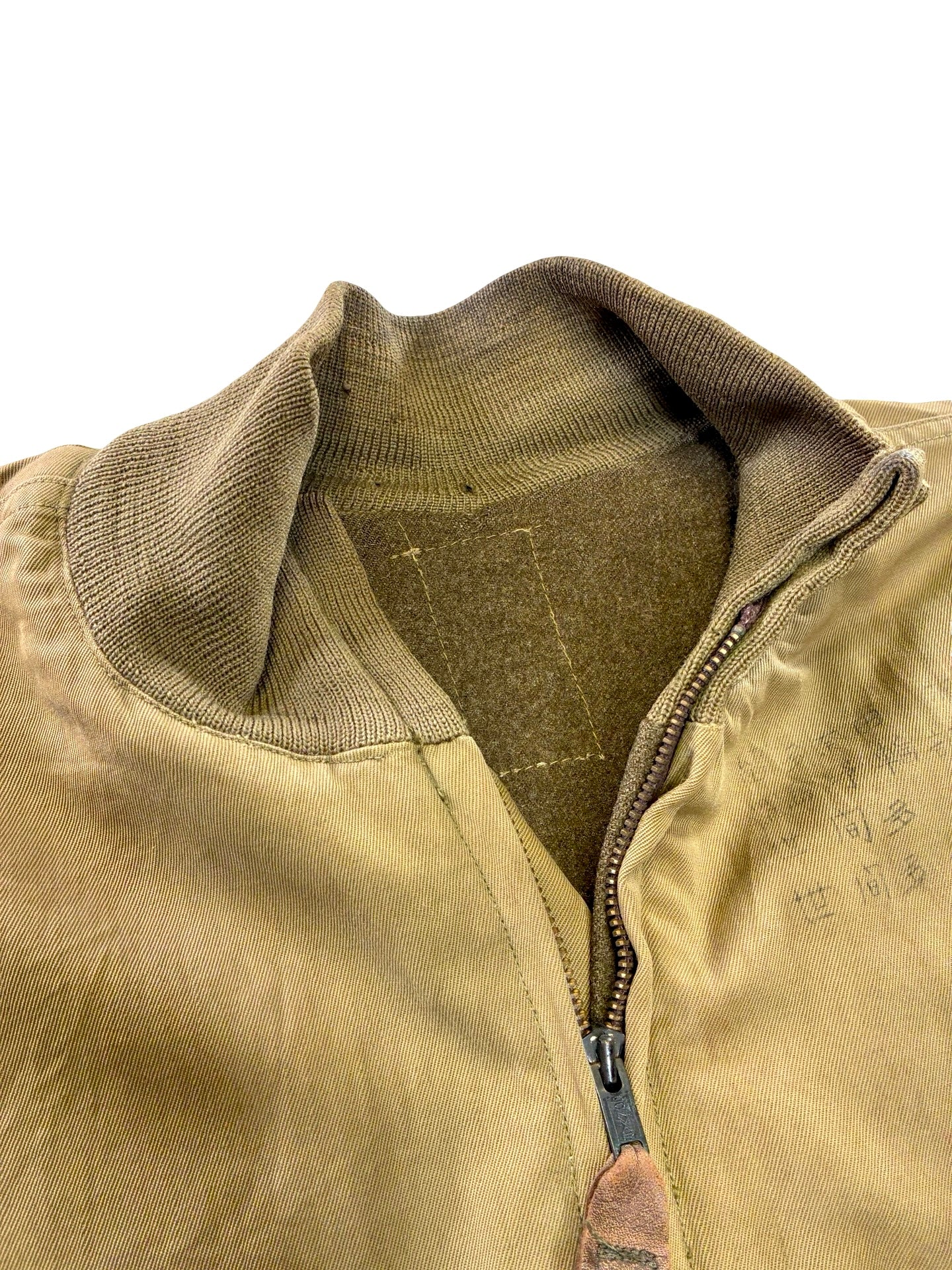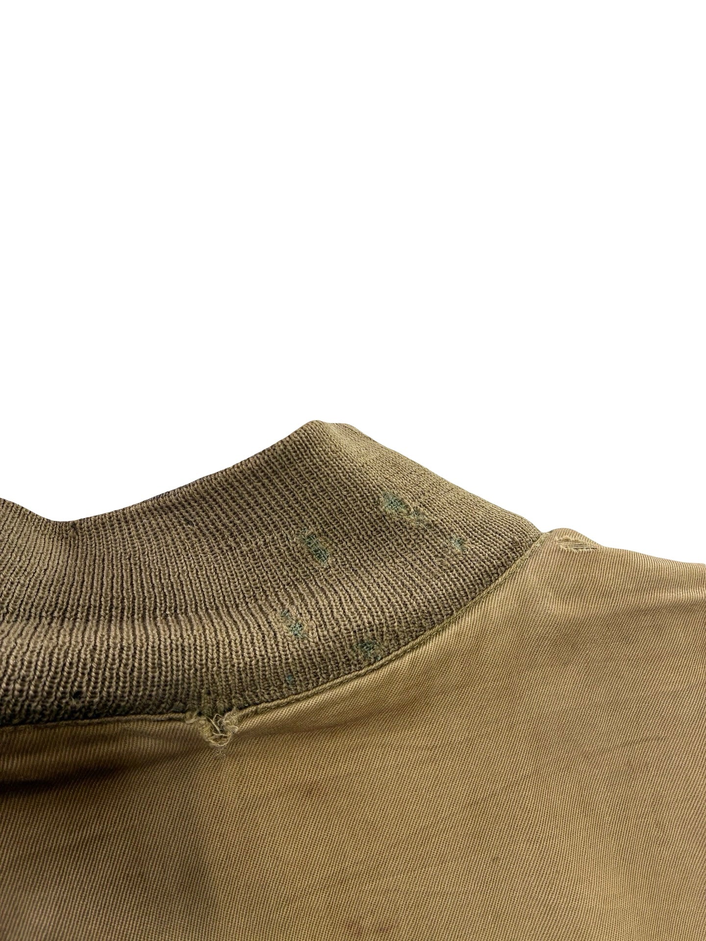 We have patch repaired some areas with period correct cloth. Small nip to fabric around neckline. Some nips to original knits, cuff knits are mash Japan replacements. Some marks to shell as seen. Sadly no label remains.