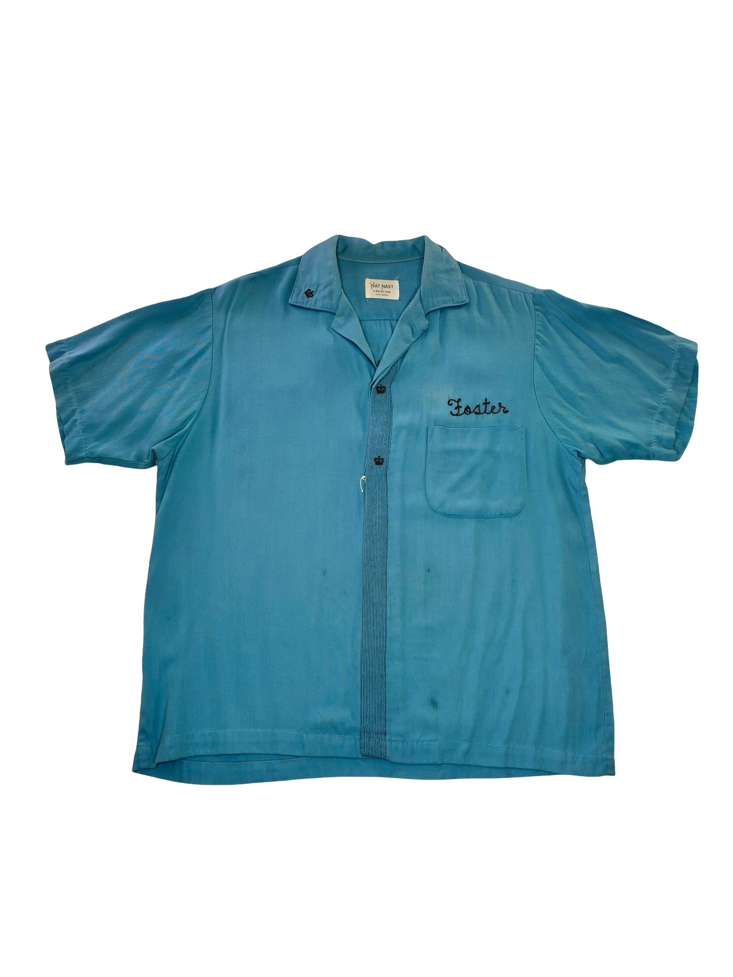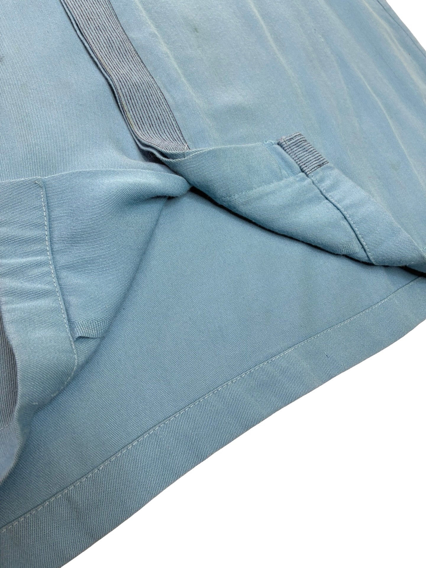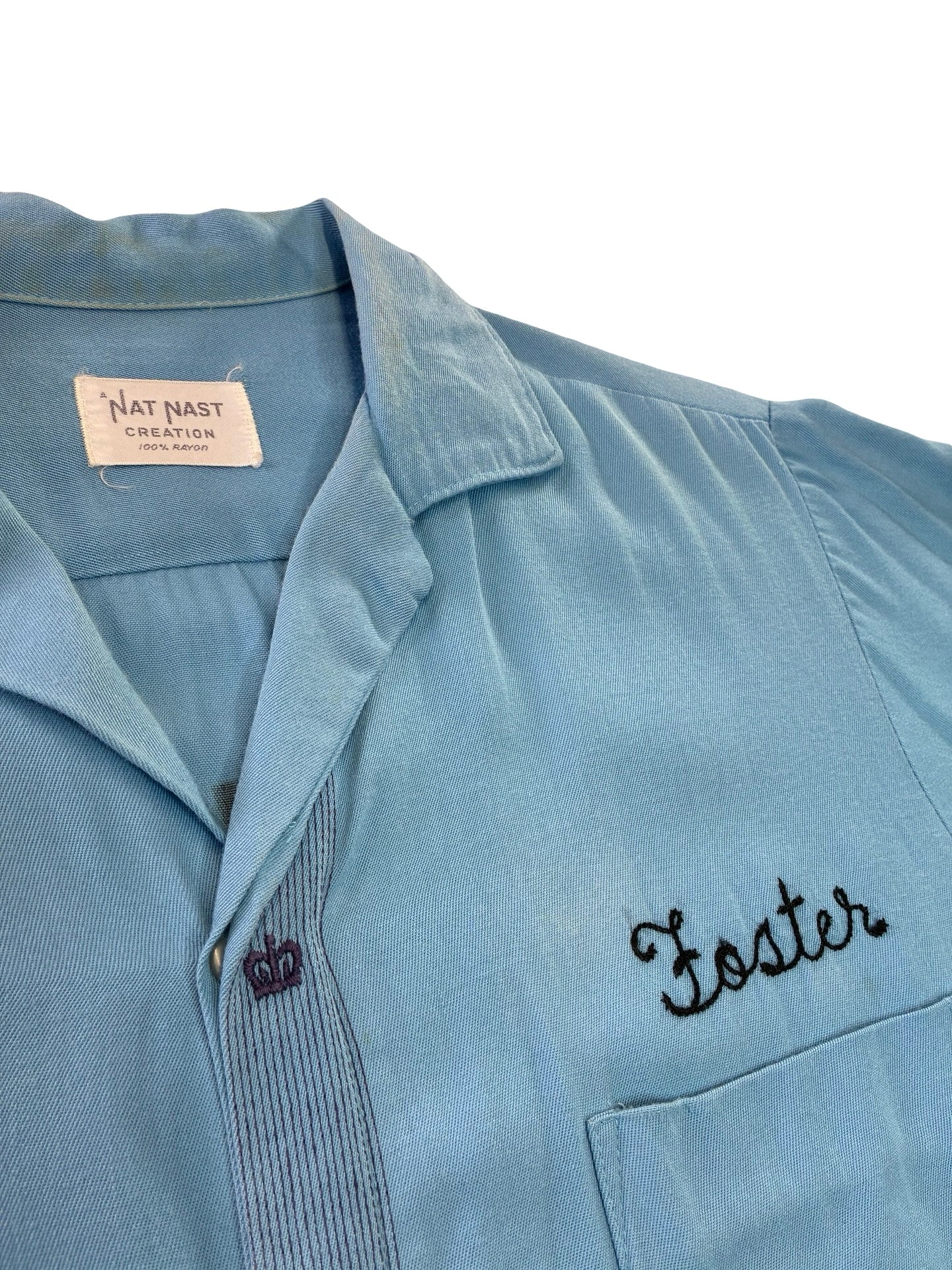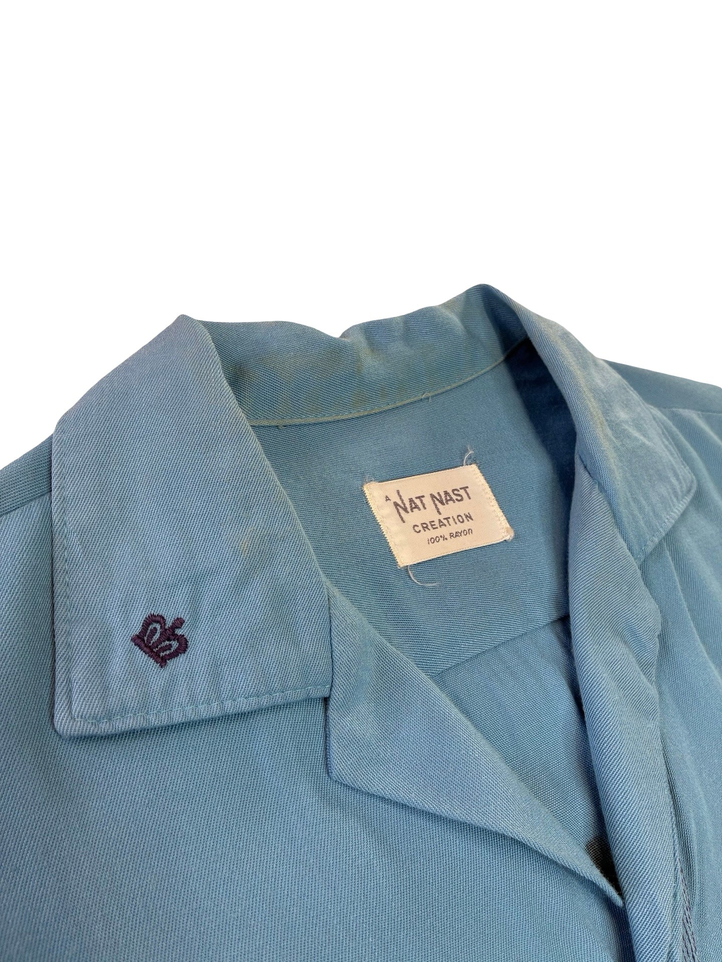 Great 1950s short sleeve bowling shirt made by Nat Nast. Classic single chest pocket design in an attractive blue rayon with chain stitched nicely above pocket and shoulder and print to back. A great piece and hard to find in a good colourway like this!