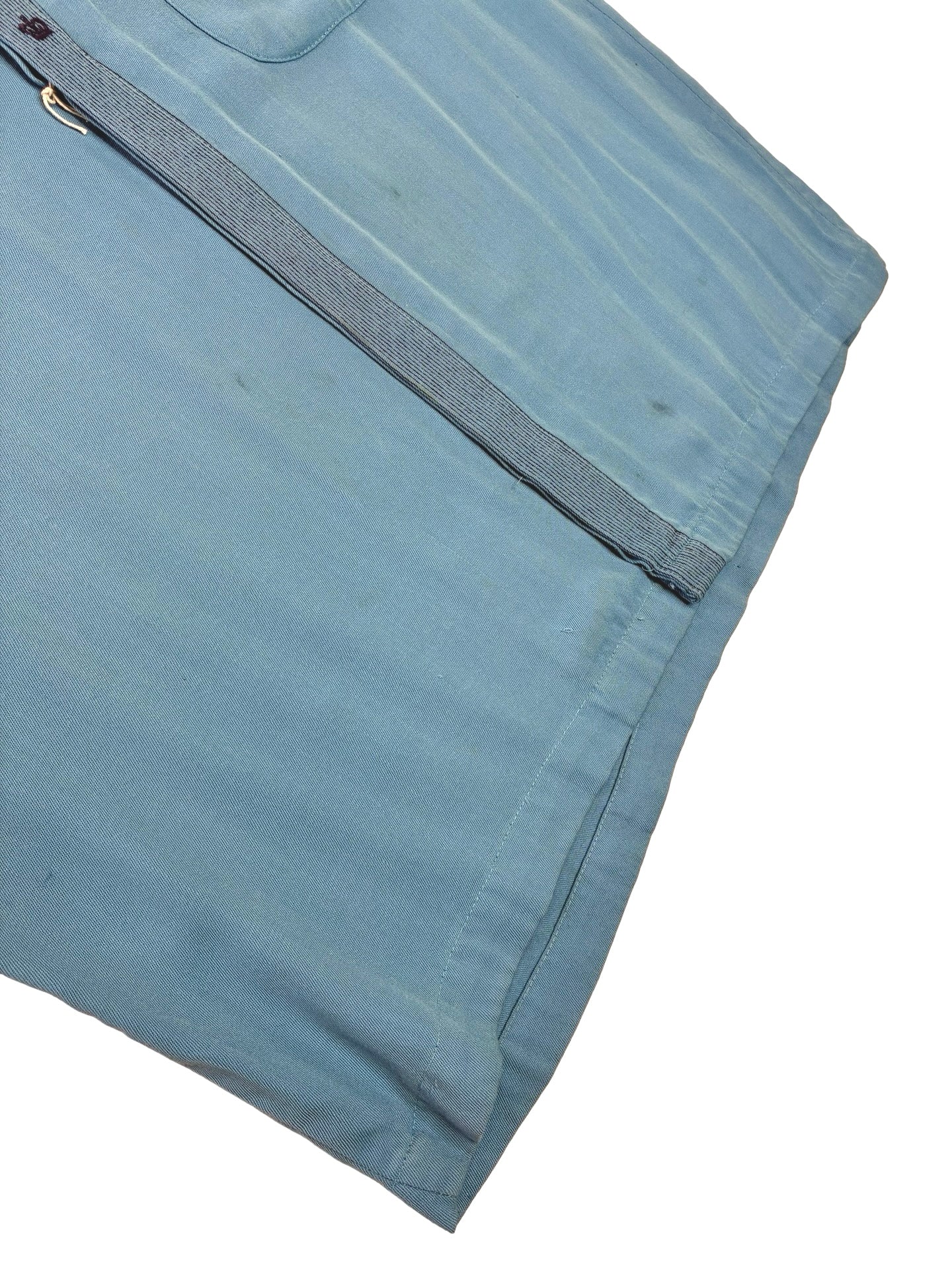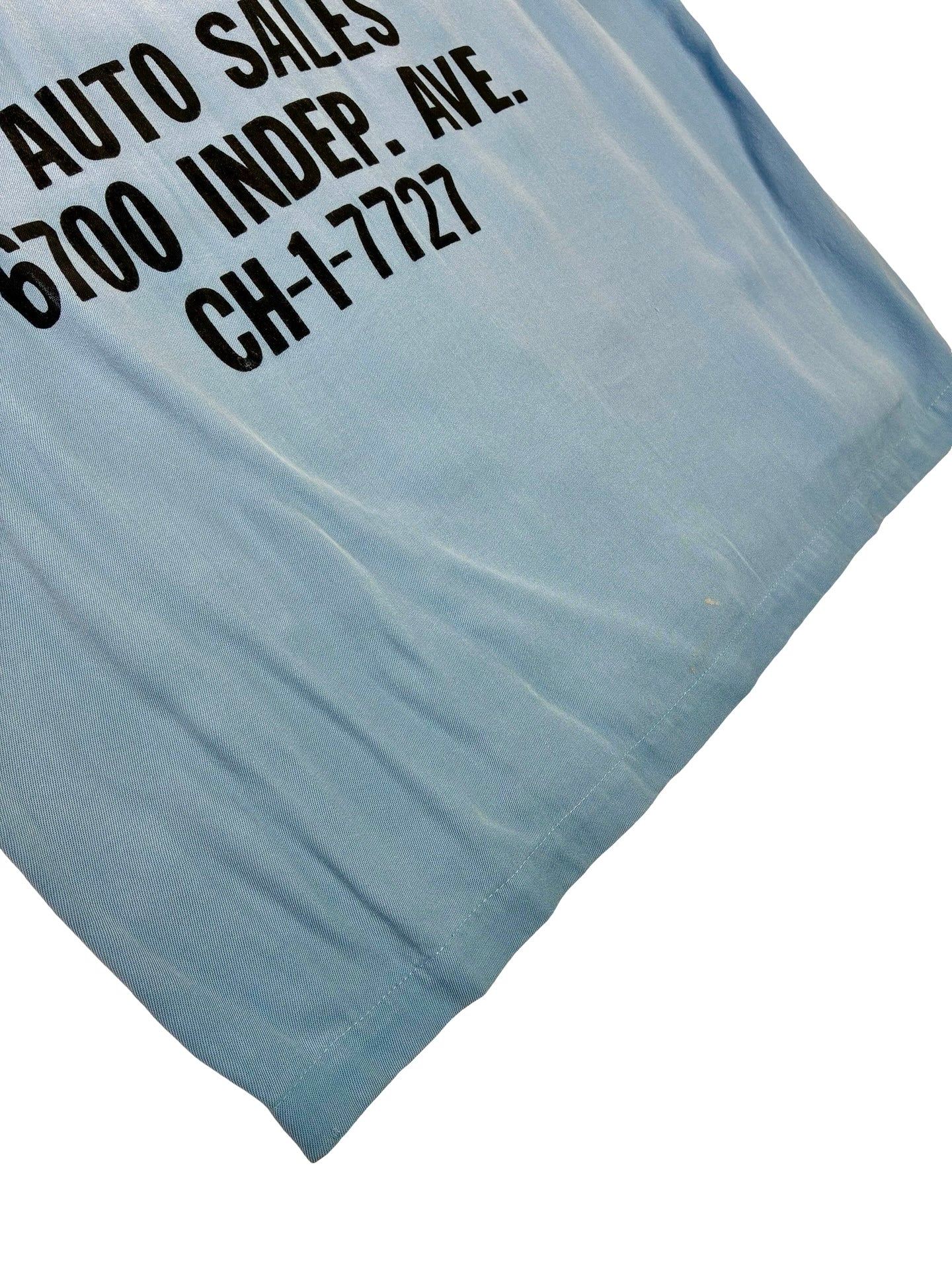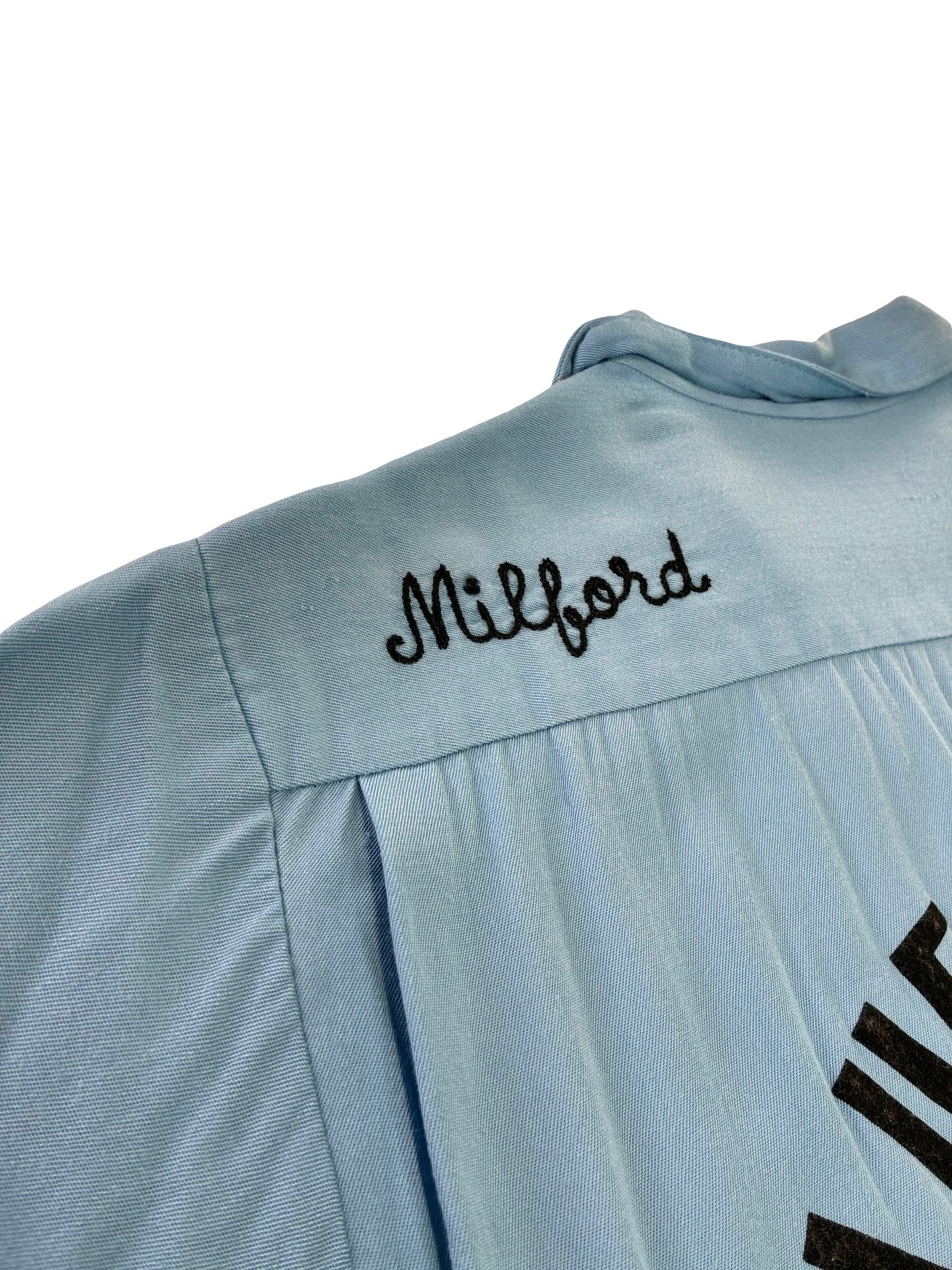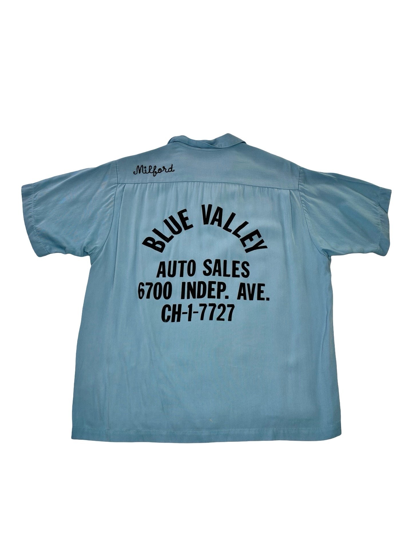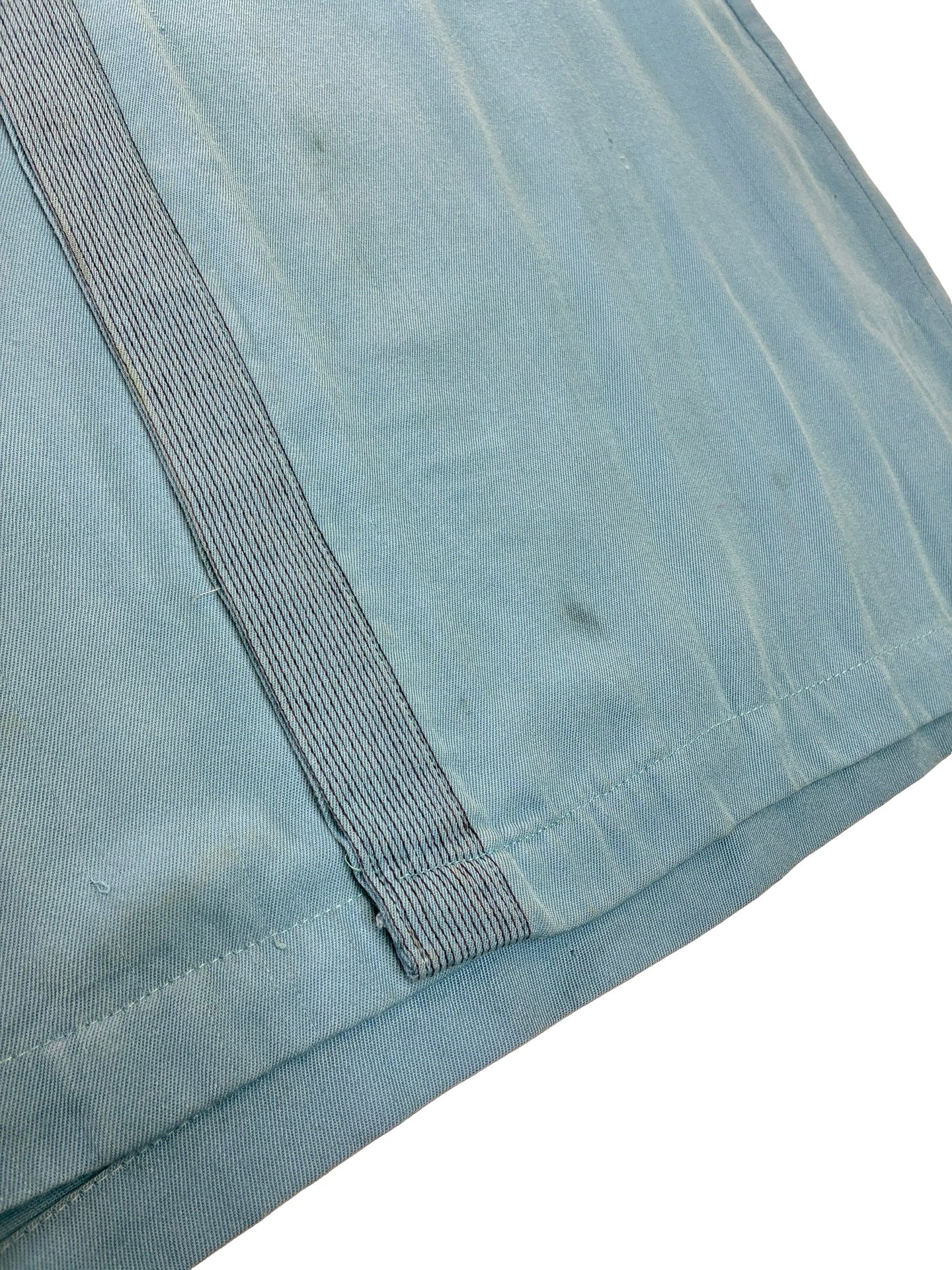 Great 1950s short sleeve bowling shirt made by Nat Nast. Classic single chest pocket design in an attractive blue rayon with chain stitched nicely above pocket and shoulder and print to back. A great piece and hard to find in a good colourway like this!