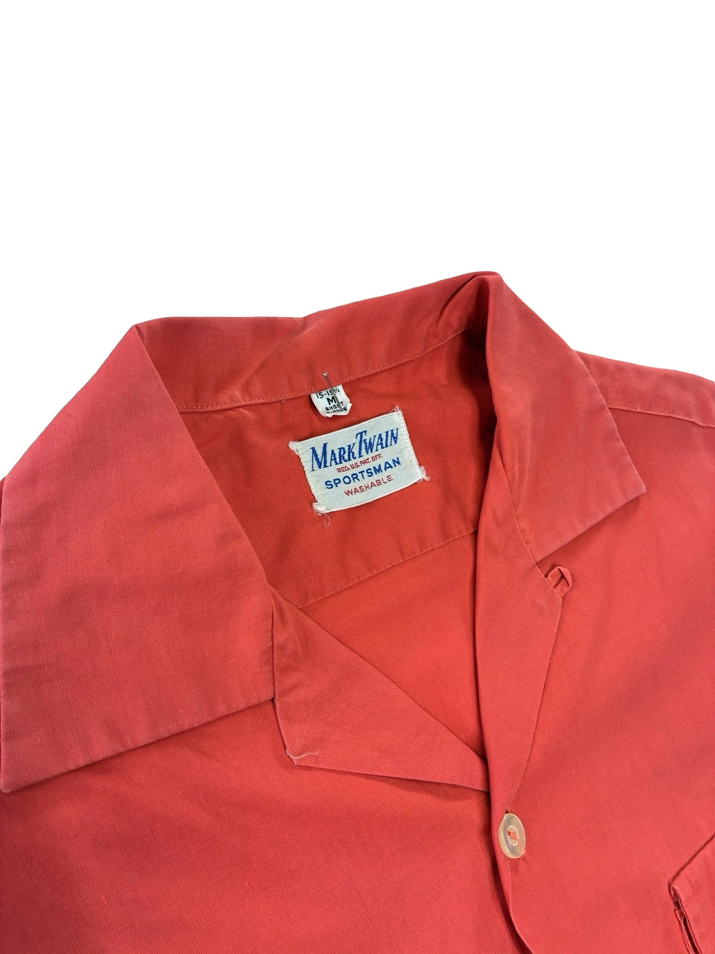 Great short sleeve bowling shirt made in the 1950s by Mark Twain brand. Classic double flap chest pocket design in an attractive faded orangey cotton with chain stitched nicely on the back. This has great sport back tailoring. A great piece and hard to find in a good colourway like this!
