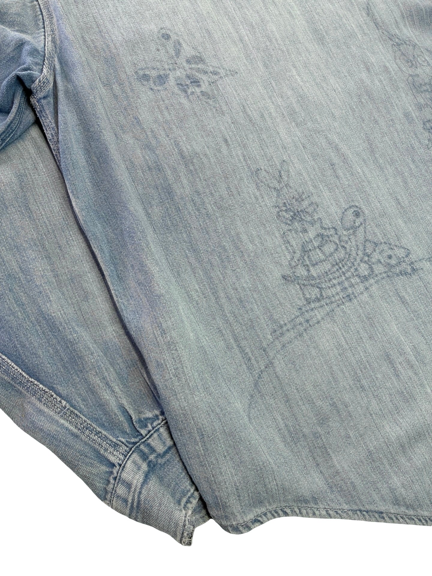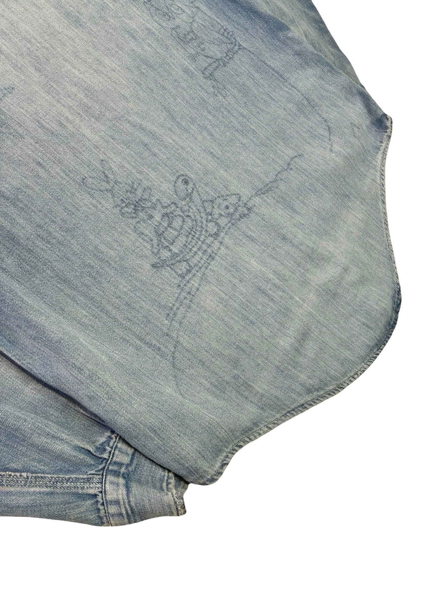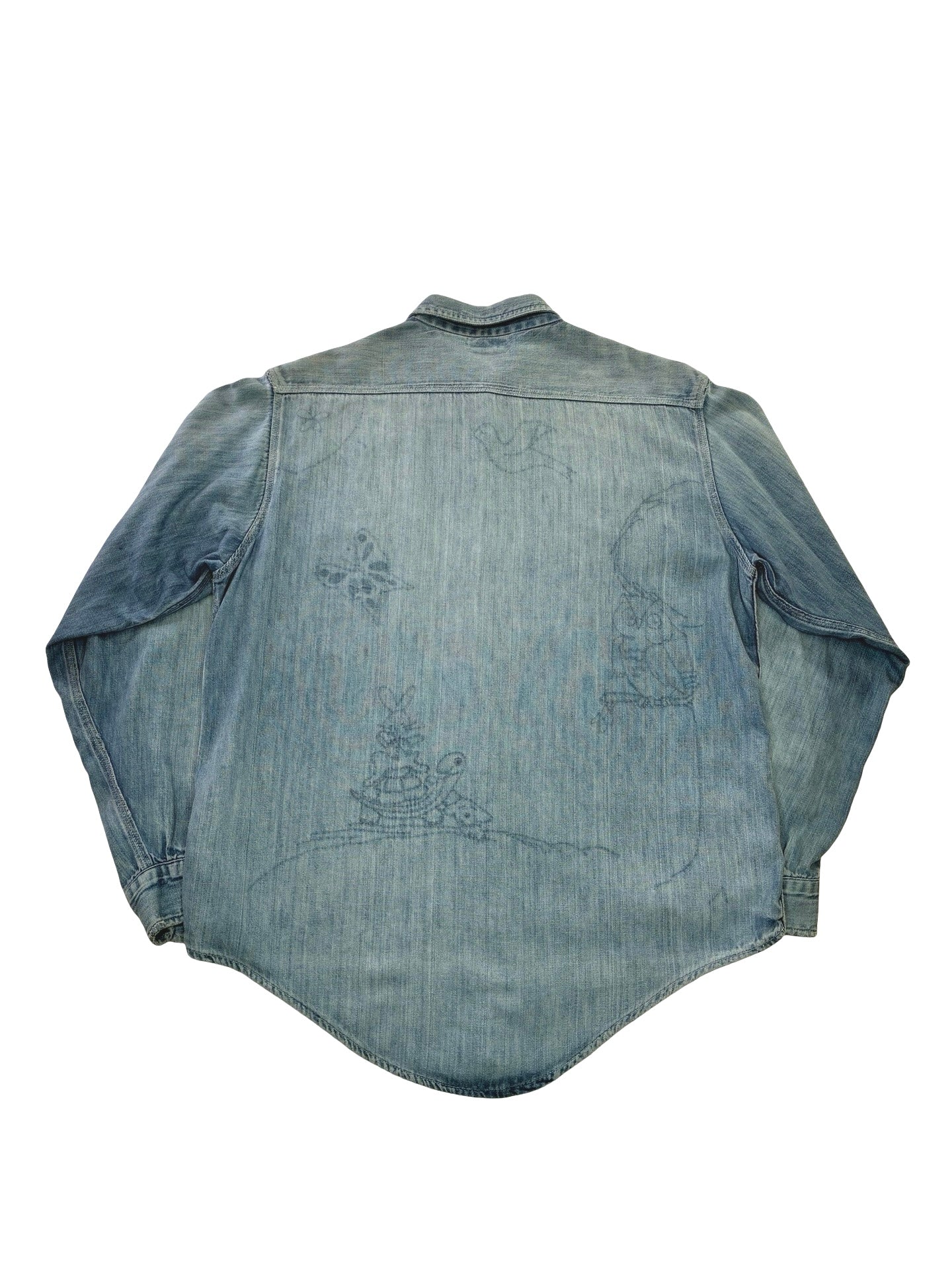 A really great 1950s work shirt by Sears Roebucks! Classic 2 pocket front with 4 eye utility buttons, it’s made from a beautiful denim that has faded and softened over its time. Most interestingly it was once embroided on the back and has since been unpicked and has left some amazing ghost stencil type fades of cartoon character!   it’s a truly one of a kind piece that translates well into a modern wardrobe.