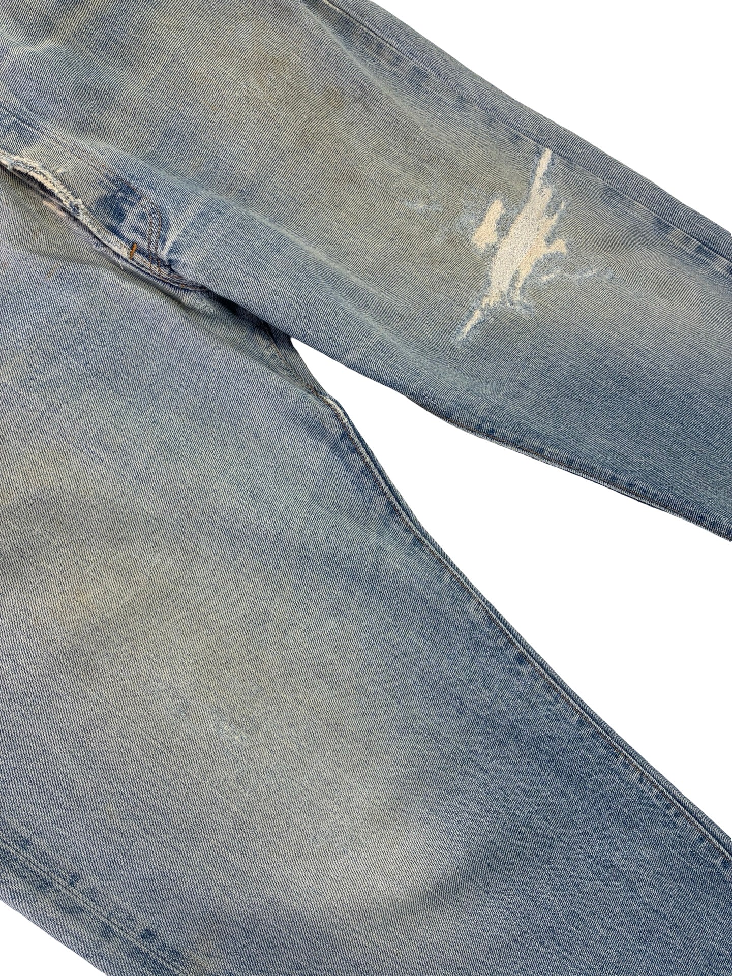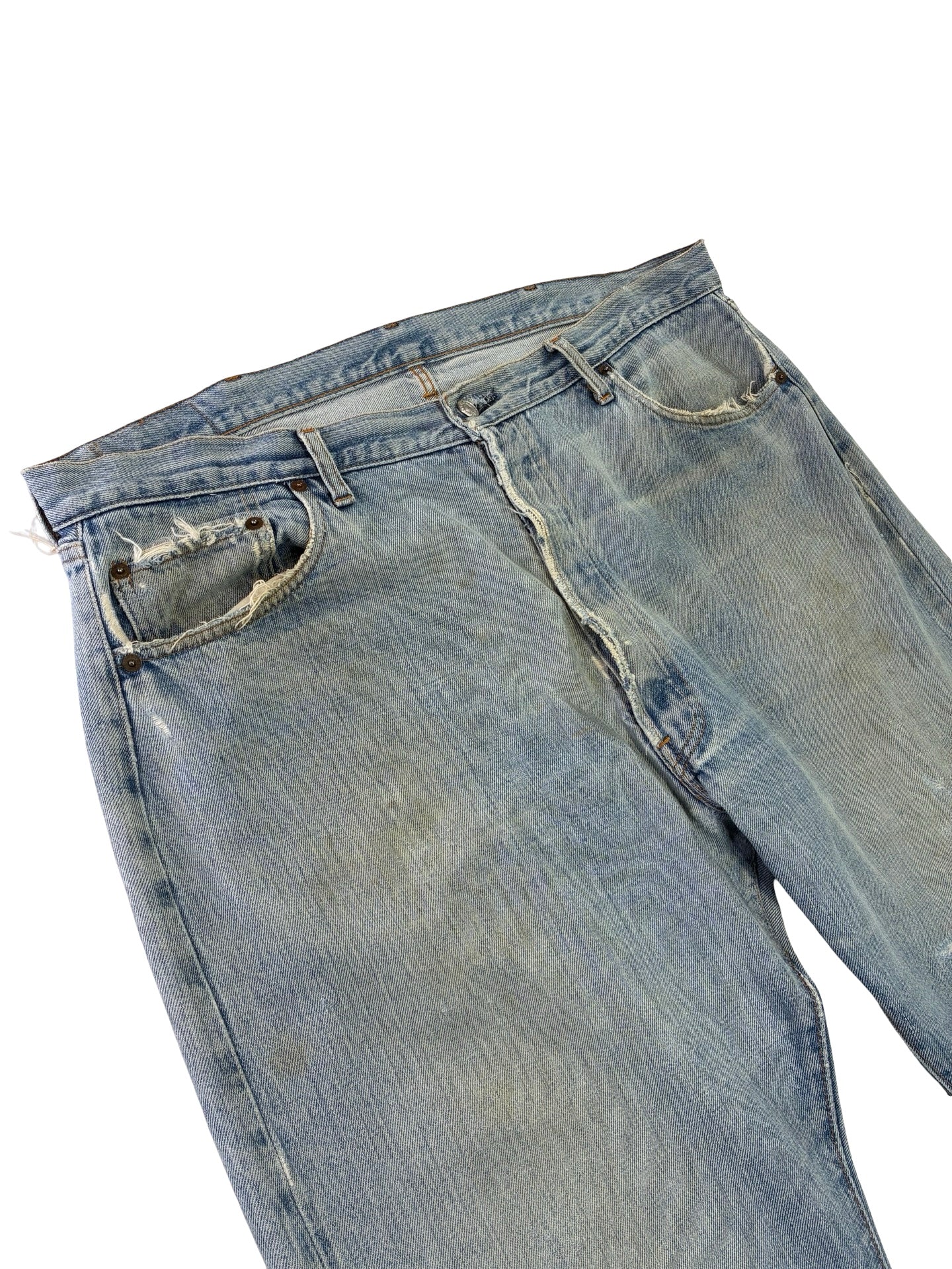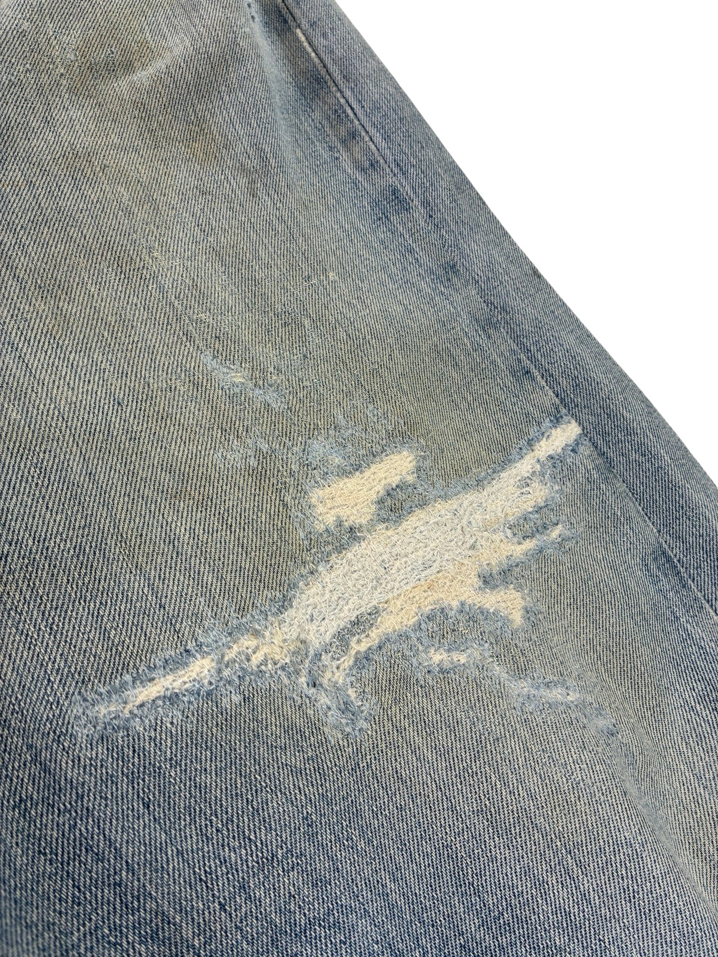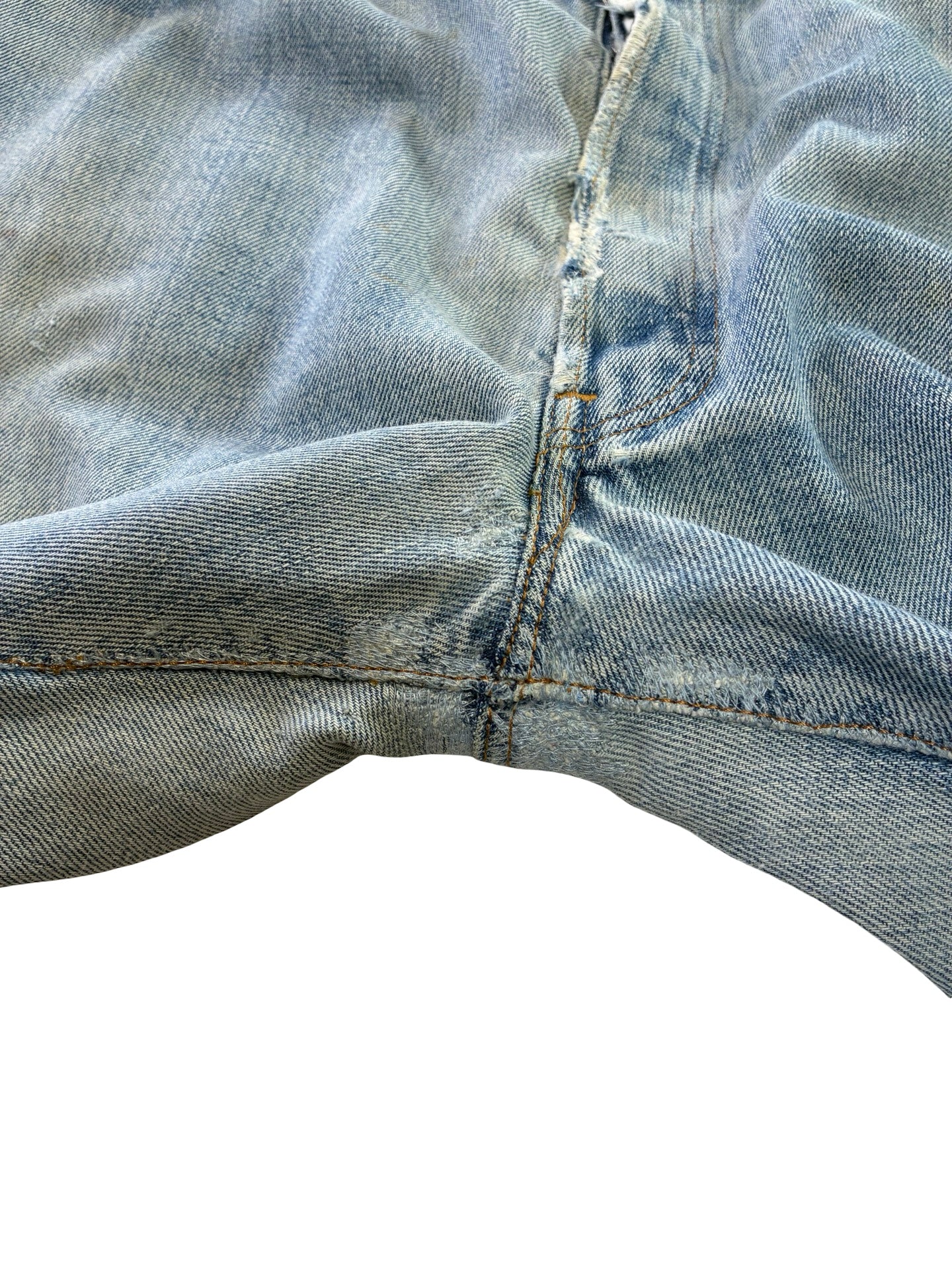 some marks and fades as expected. Been repaired to the leg, crotch and button holes! Frays to hems.